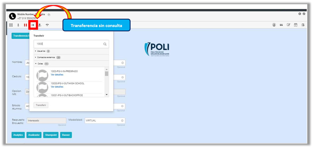 • PARA TRANSFERIR A EDUCACION PARA LA VIDA DEBES ENVIAR AL ESTUDIANTE DIRECTAMENTE AL IVR EN INDICARLE QUE MARQUE LA OPCIÓN #5 - Le das clic a la opción de transferir.